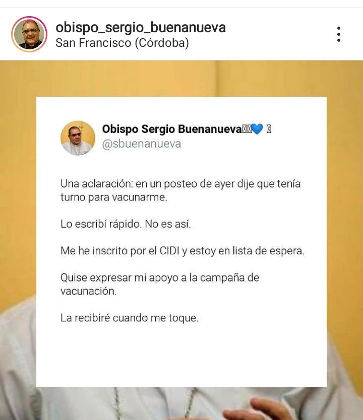 Este lunes, Monseñor Buenanueva, otra vez a través de sus plataformas digitales aclaró la situación: «Una aclaración: En un posteo de ayer dije que tenía turno para vacunarme. Lo escribí rápido. No es así. Me he inscripto por el CIDI y estoy en lista de espera. Quise expresar mi apoyo a la campaña de vacunación. La recibiré cuando me toque».