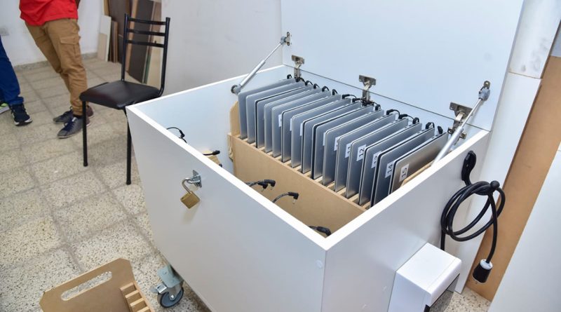 Se trata de dos carros que permiten el traslado de las notebooks entre las aulas del establecimiento educativo, equipado con un sistema que permite la carga de los equipos estando en reposo.