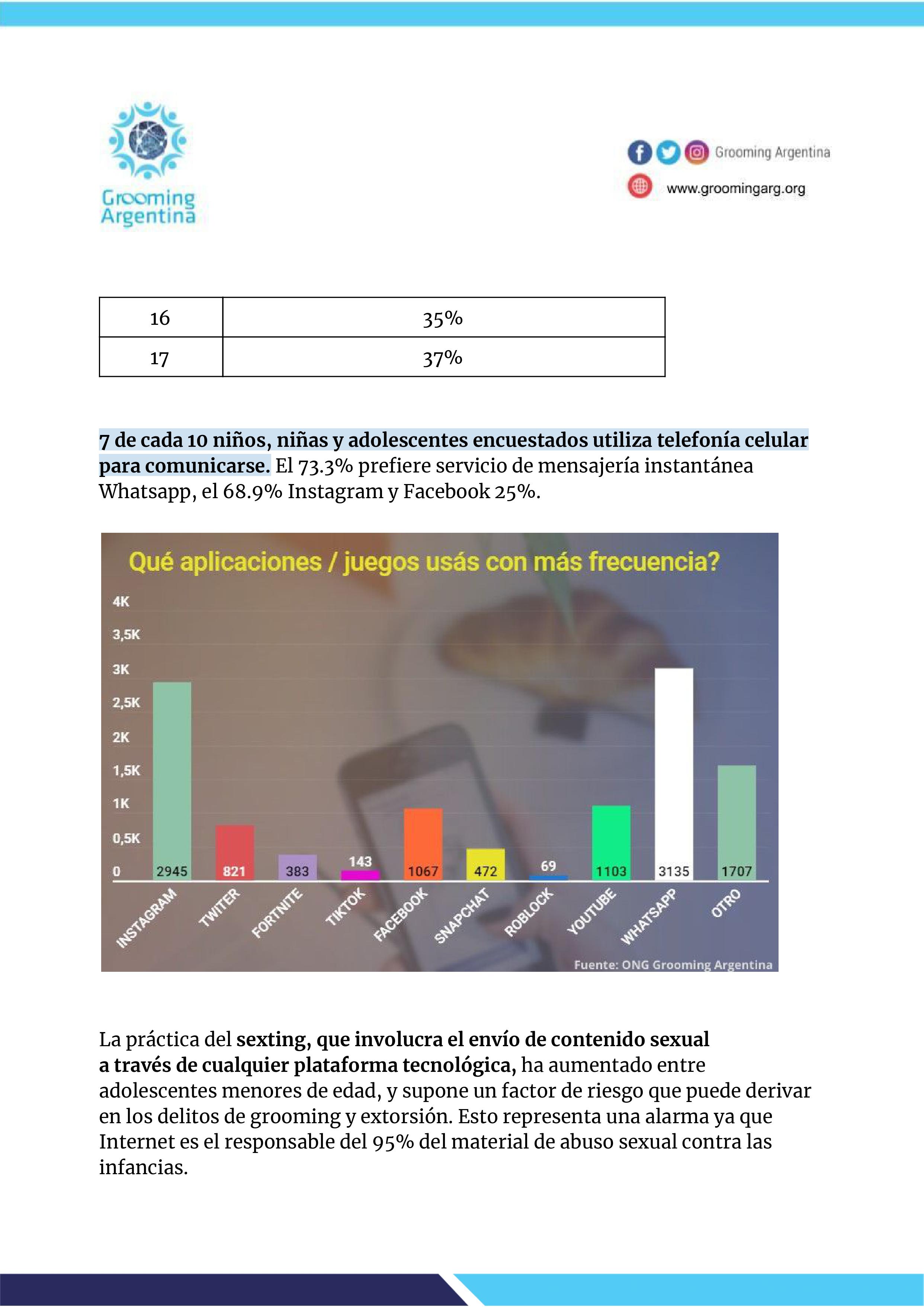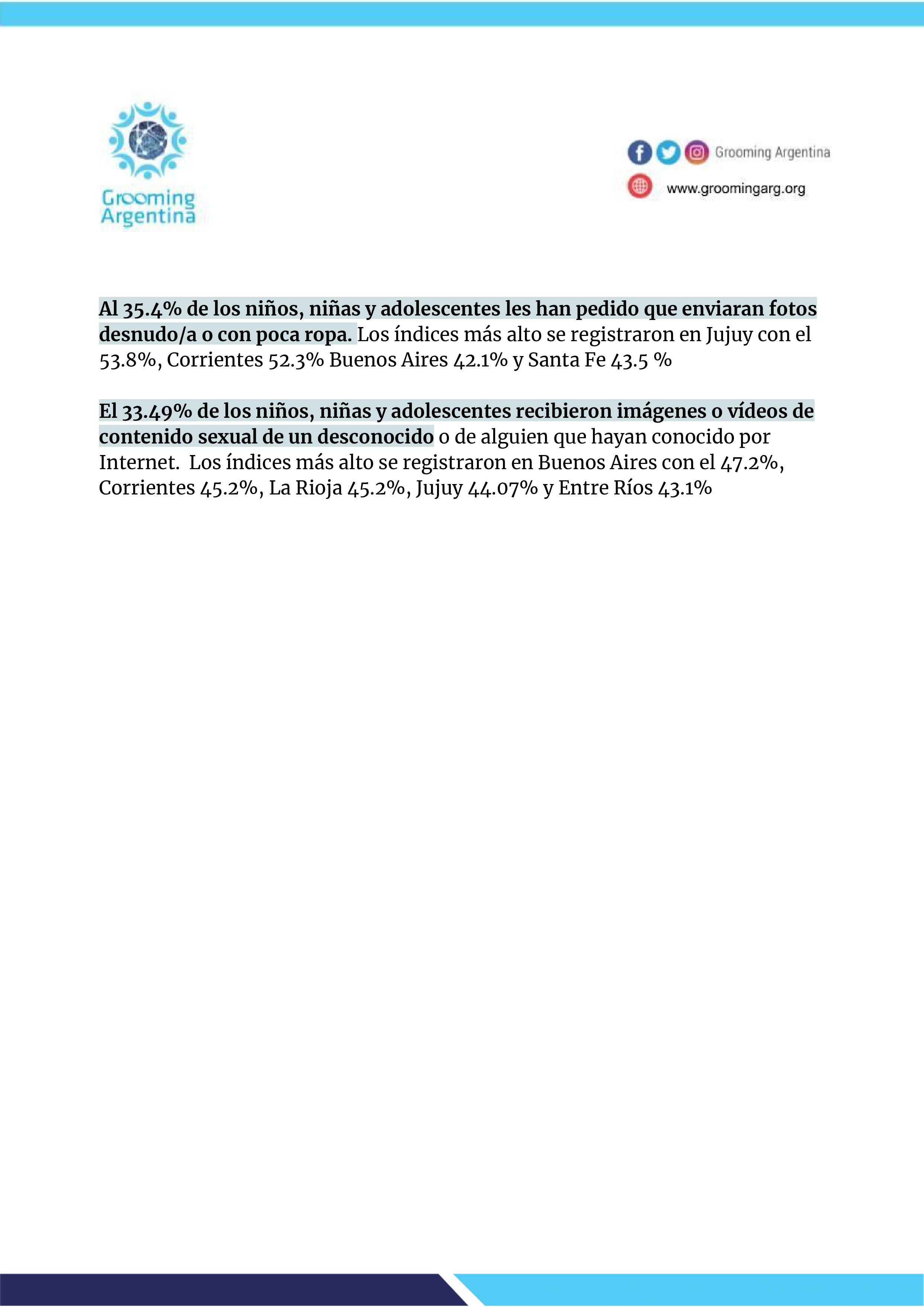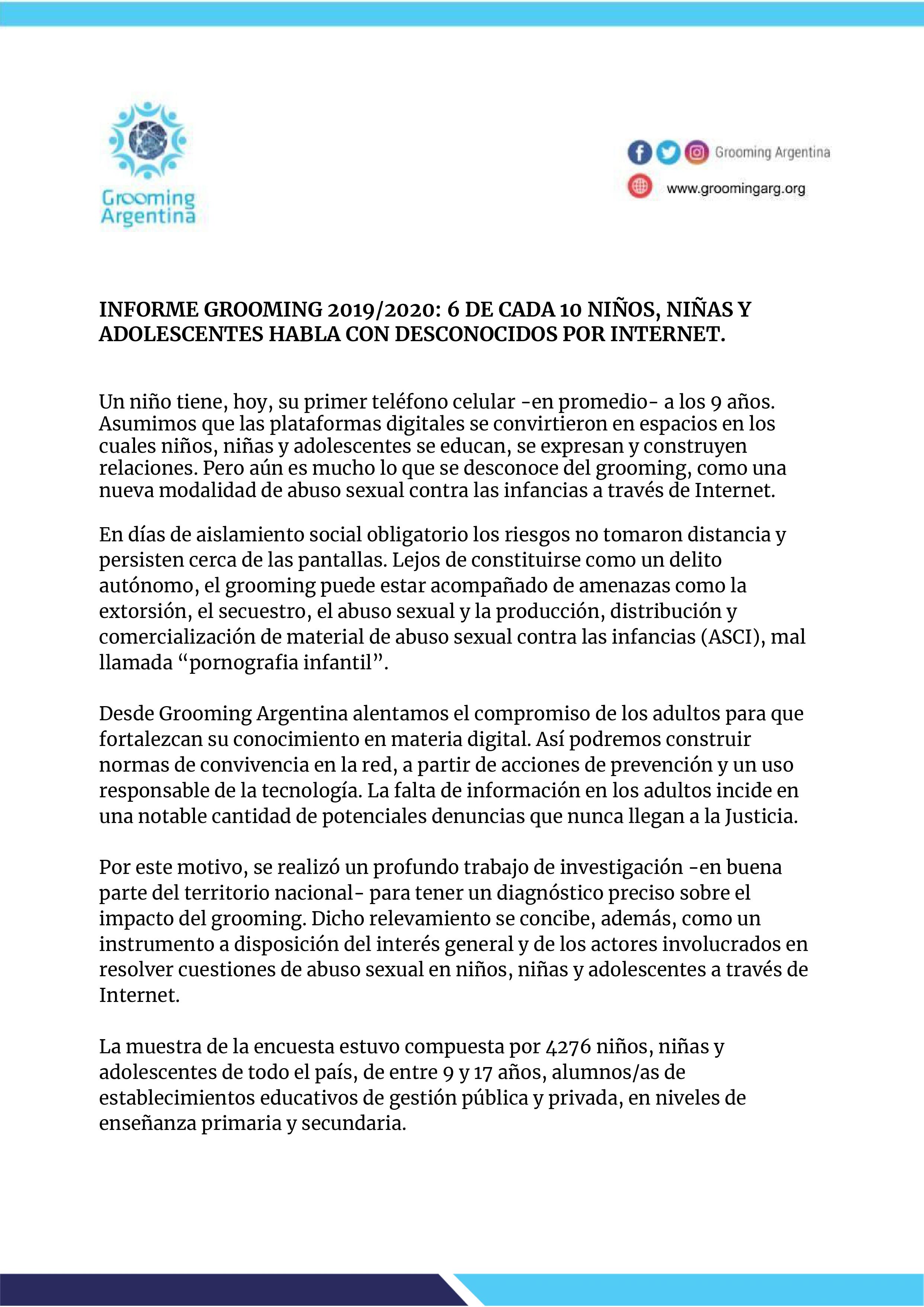 Por este motivo, se realizó un profundo trabajo de investigación -en buena parte del territorio nacional- para tener un diagnóstico preciso sobre el impacto del grooming. Dicho relevamiento se concibe, además, como un instrumento a disposición del interés general y de los actores involucrados en resolver cuestiones de abuso sexual en niños, niñas y adolescentes a través de Internet.