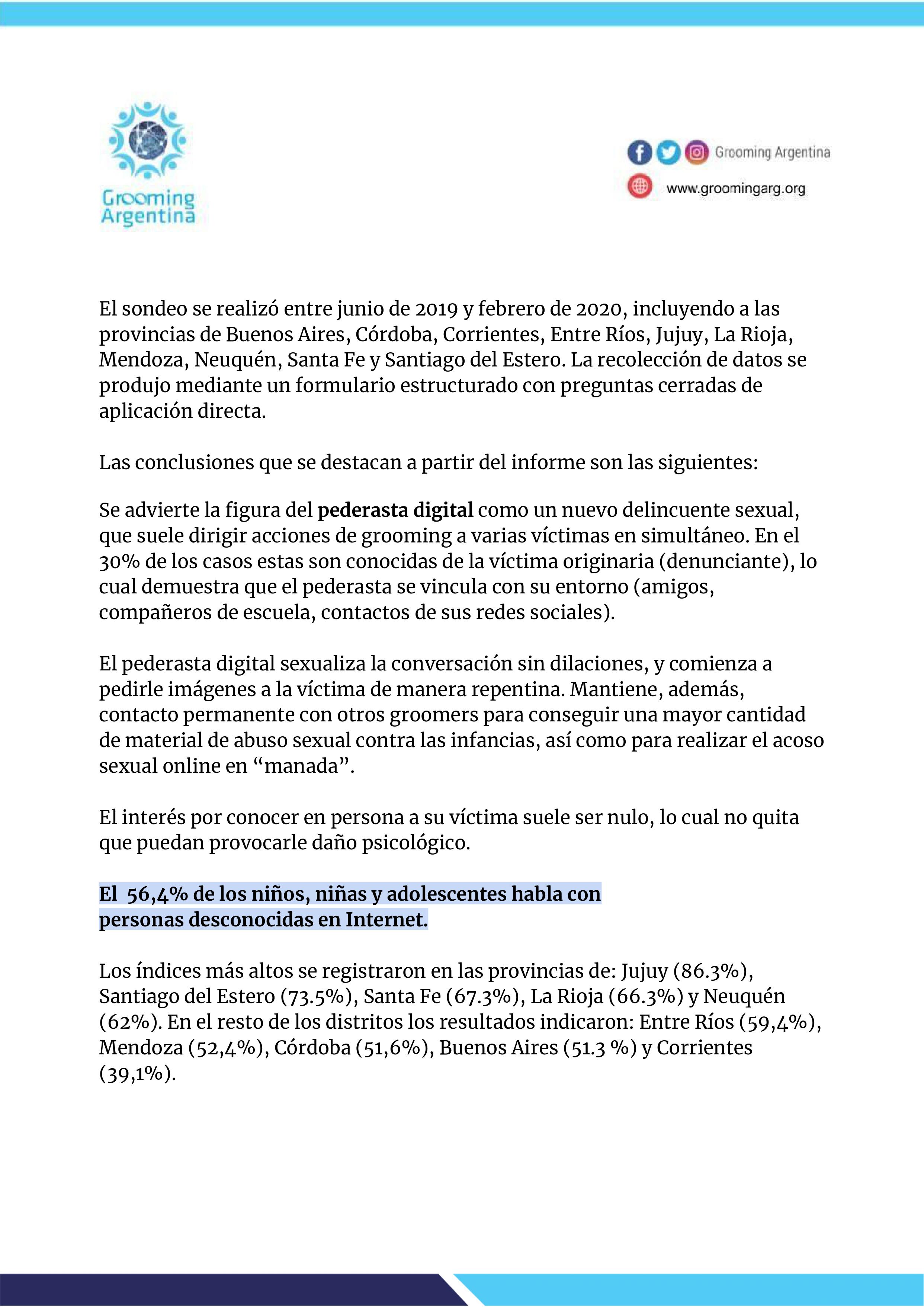 Por este motivo, se realizó un profundo trabajo de investigación -en buena parte del territorio nacional- para tener un diagnóstico preciso sobre el impacto del grooming. Dicho relevamiento se concibe, además, como un instrumento a disposición del interés general y de los actores involucrados en resolver cuestiones de abuso sexual en niños, niñas y adolescentes a través de Internet.