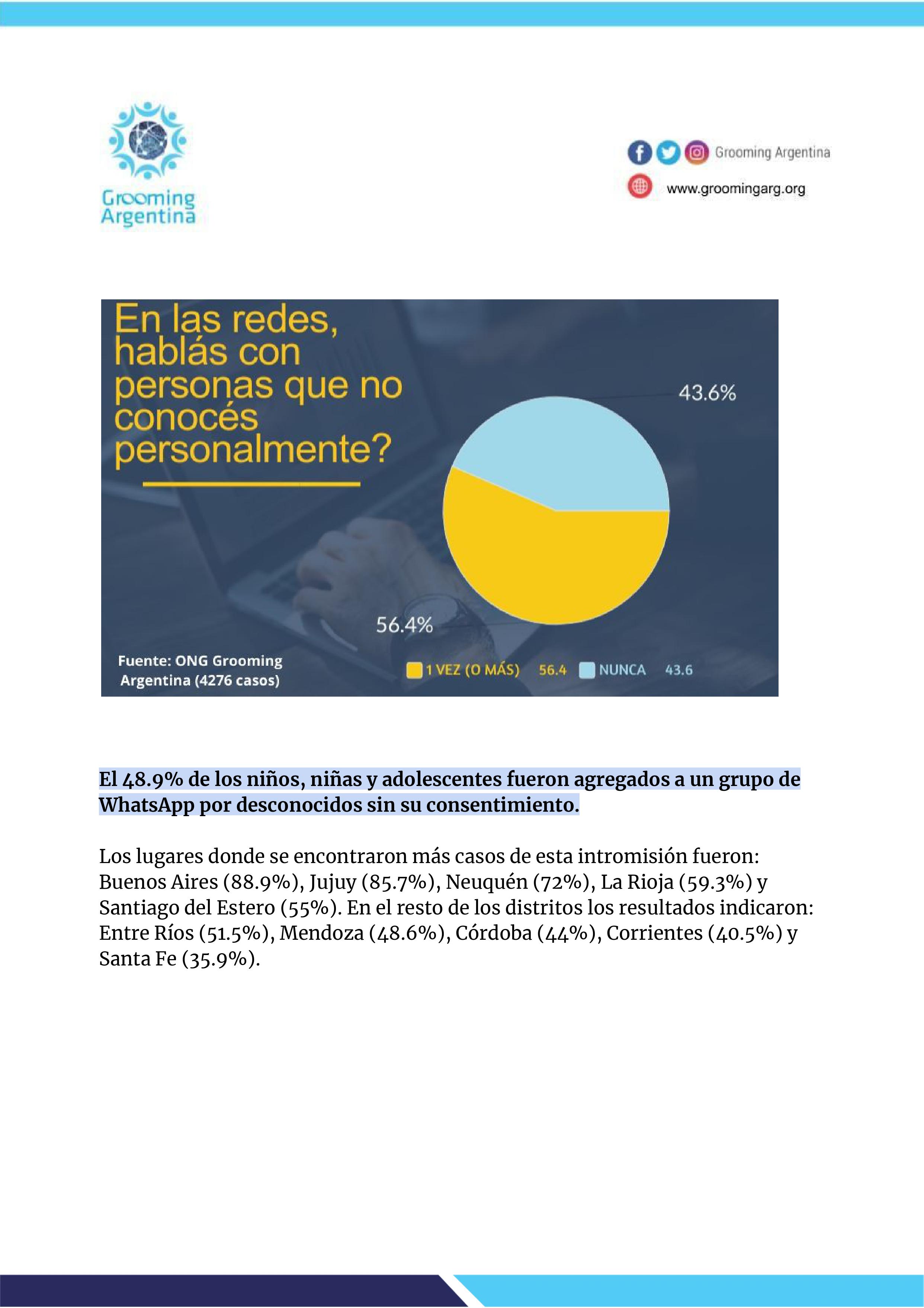 El 48.9% de los niños, niñas y adolescentes fueron agregados a un grupo de WhatsApp por desconocidos sin su consentimiento. Los lugares donde se encontraron más casos de esta intromisión fueron: Buenos Aires (88.9%), Jujuy (85.7%), Neuquén (72%), La Rioja (59.3%) y Santiago del Estero (55%). En el resto de los distritos los resultados indicaron: Entre Ríos (51.5%), Mendoza (48.6%), Córdoba (44%), Corrientes (40.5%) y Santa Fe (35.9%).
