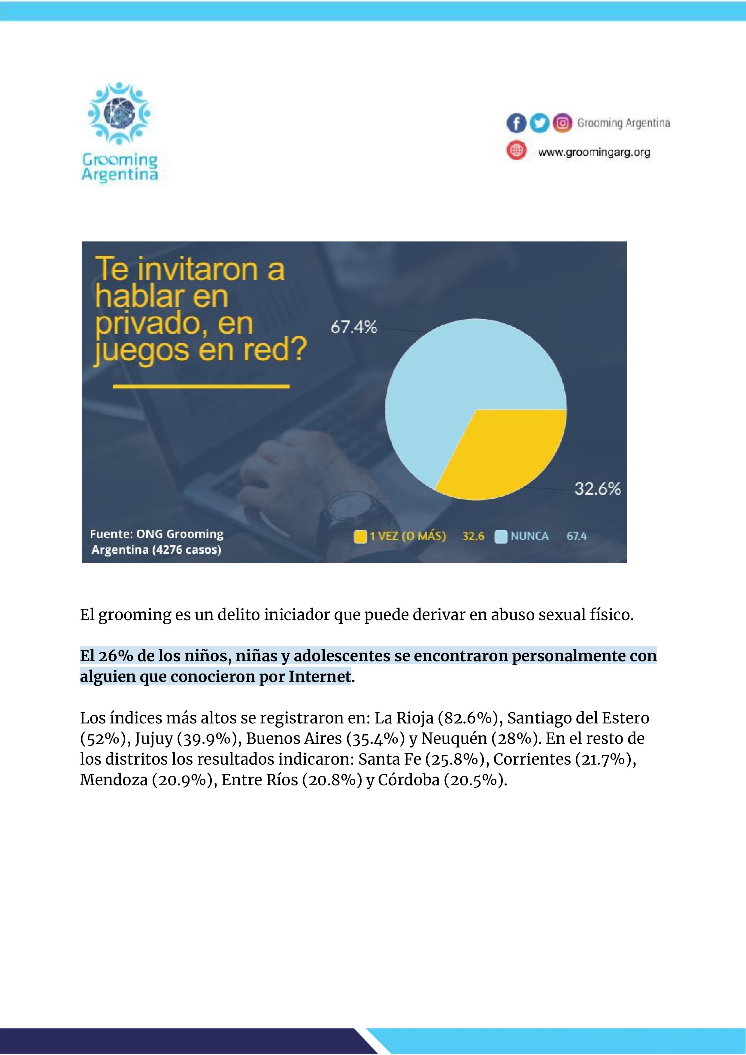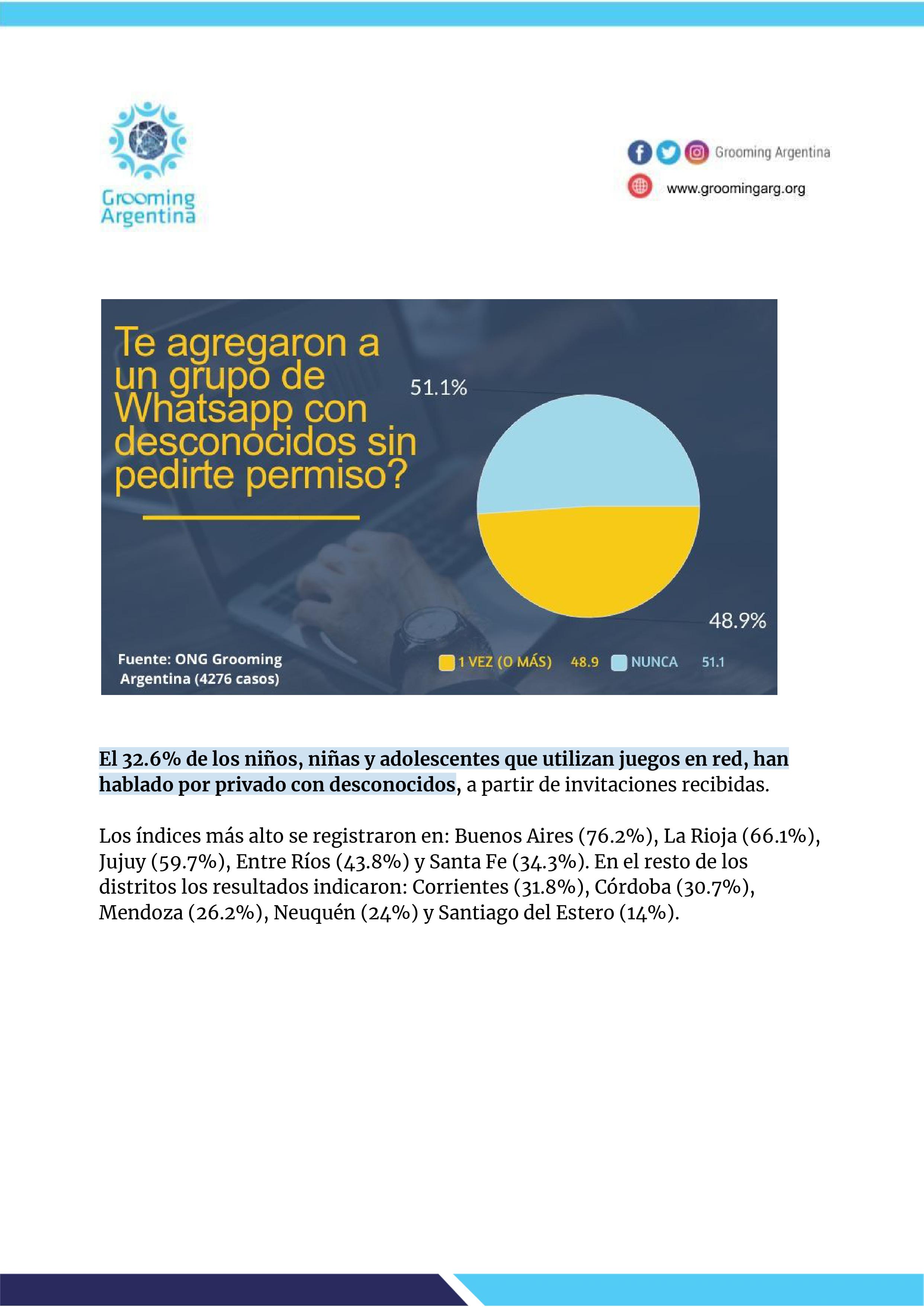 El 32.6% de los niños, niñas y adolescentes que utilizan juegos en red, han hablado por privado con desconocidos, a partir de invitaciones recibidas. Los índices más alto se registraron en: Buenos Aires (76.2%), La Rioja (66.1%), Jujuy (59.7%), Entre Ríos (43.8%) y Santa Fe (34.3%). En el resto de los distritos los resultados indicaron: Corrientes (31.8%), Córdoba (30.7%), Mendoza (26.2%), Neuquén (24%) y Santiago del Estero (14%).