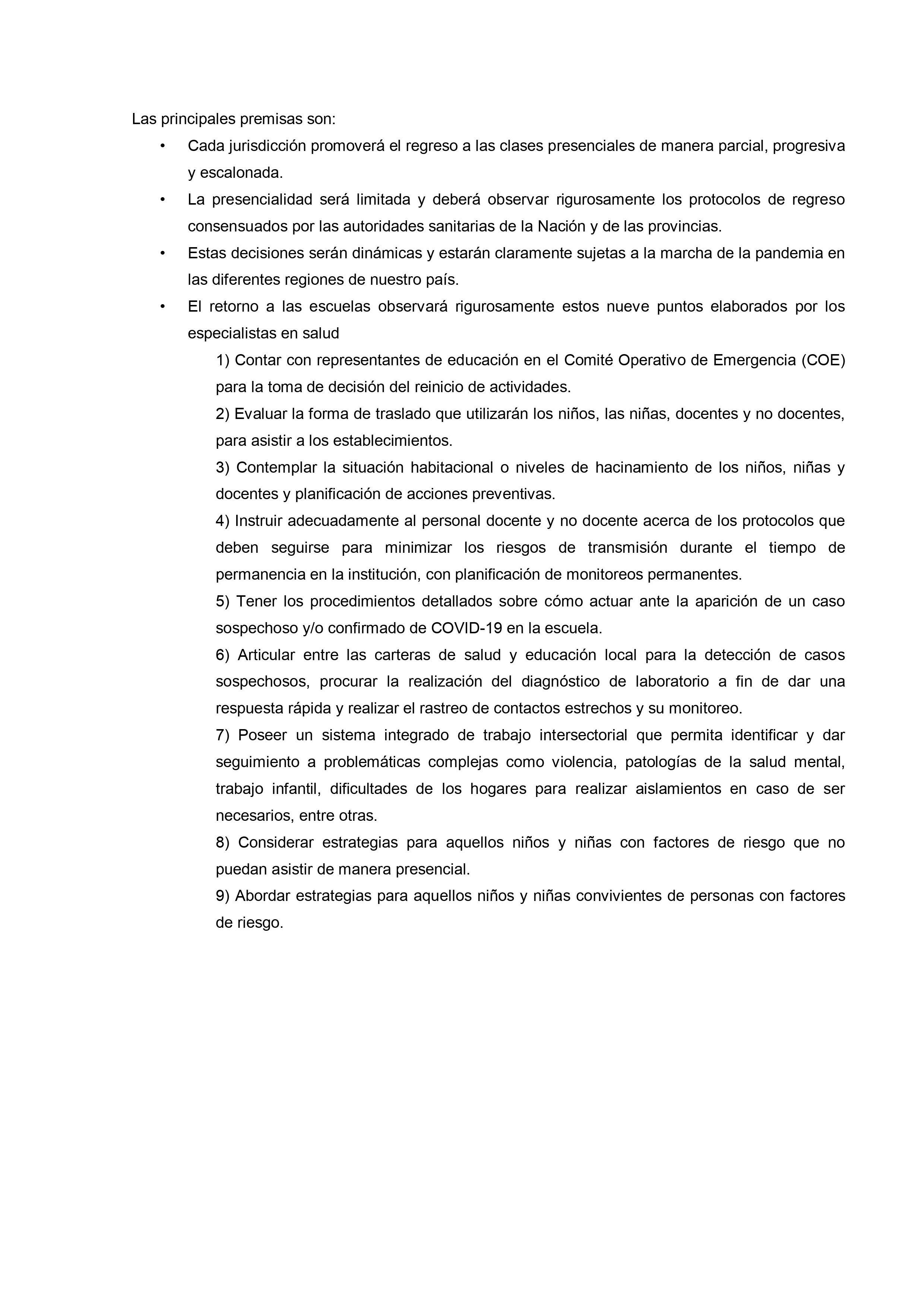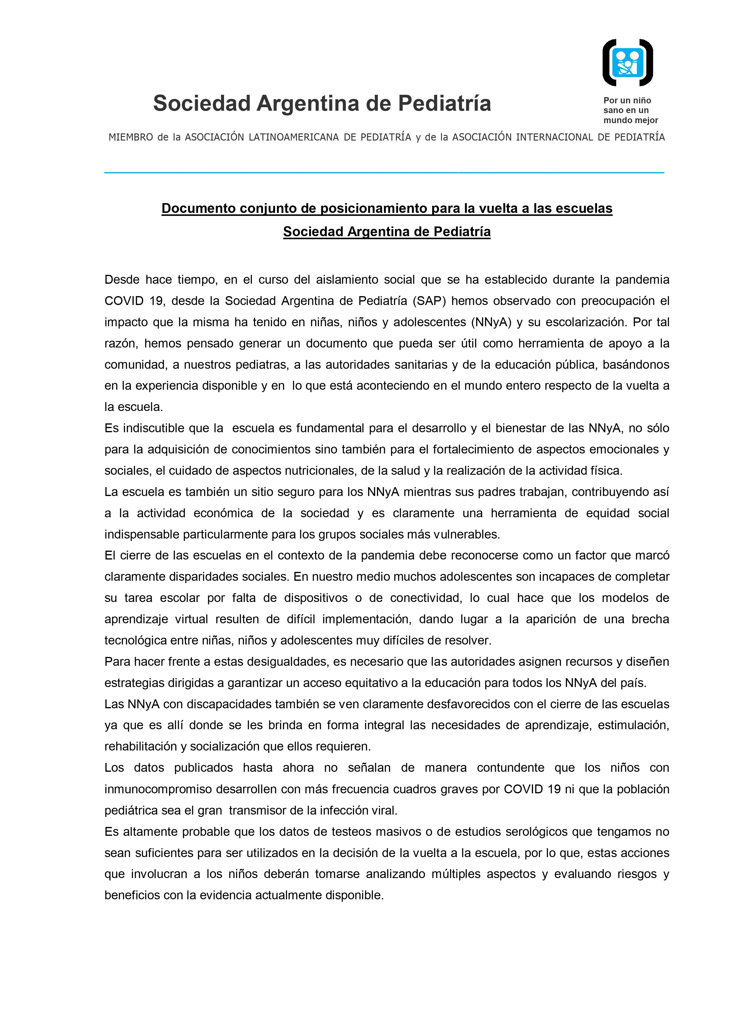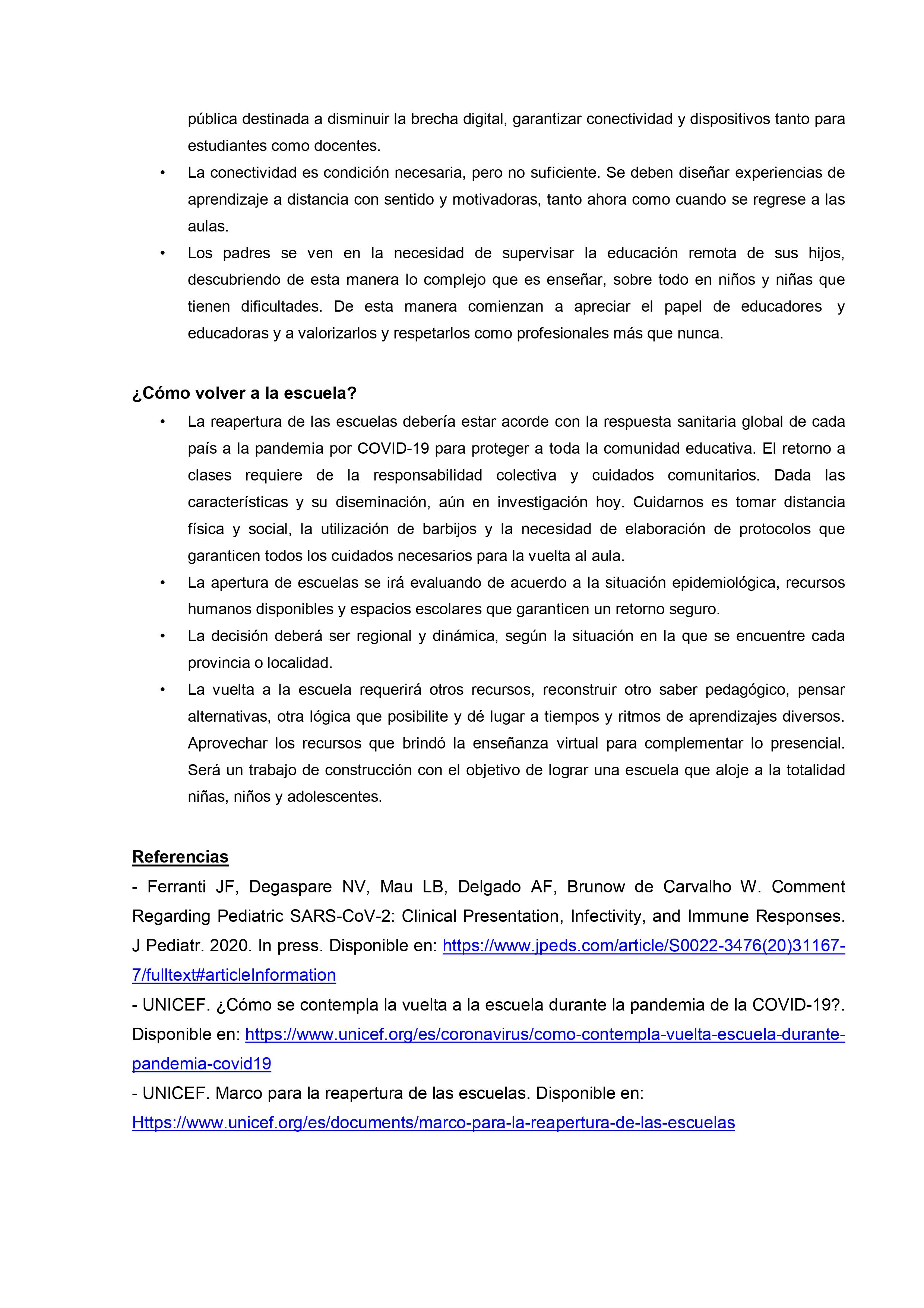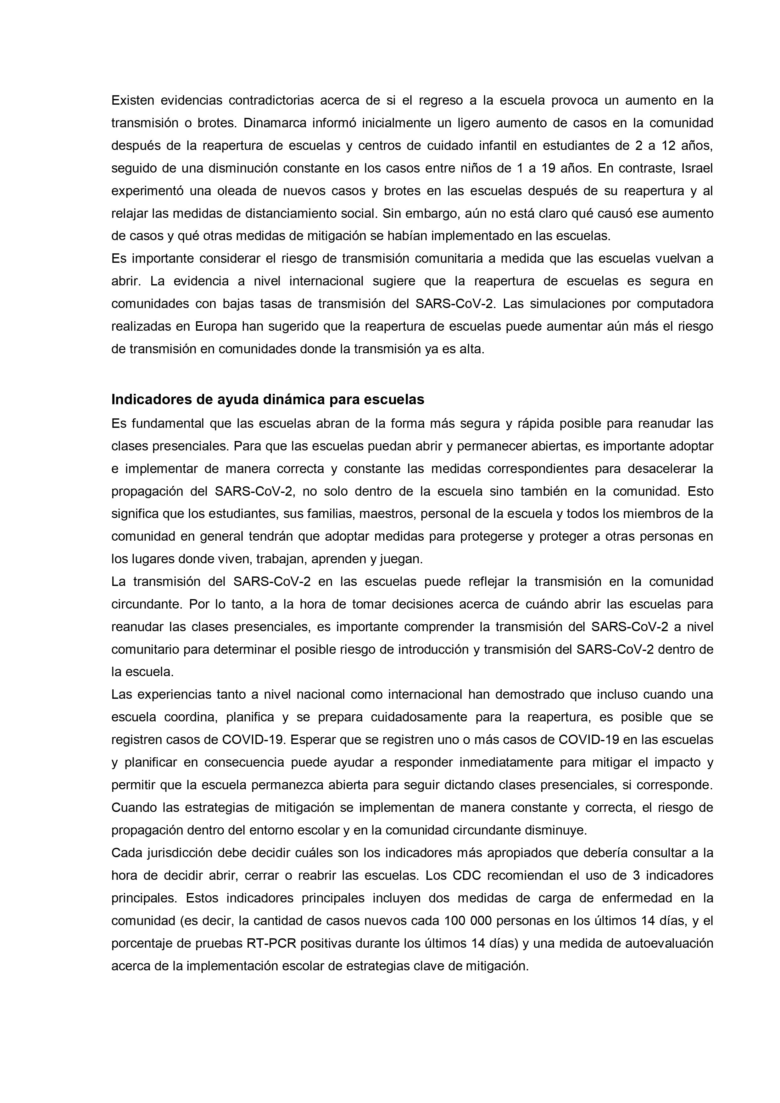 En un extenso informe del que participan otras organizaciones vinculadas al tema desde el ámbito de la salud y del bienestar se sostiene que, con los cuidados pertinentes «es fundamental que las escuelas abran de la forma más segura y rápida posible para reanudar las clases presenciales. Para que las escuelas puedan abrir y permanecer abiertas, es importante adoptar e implementar de manera correcta y constante las medidas correspondientes para desacelerar la propagación del SARS-CoV-2, no solo dentro de la escuela sino también en la comunidad.»
