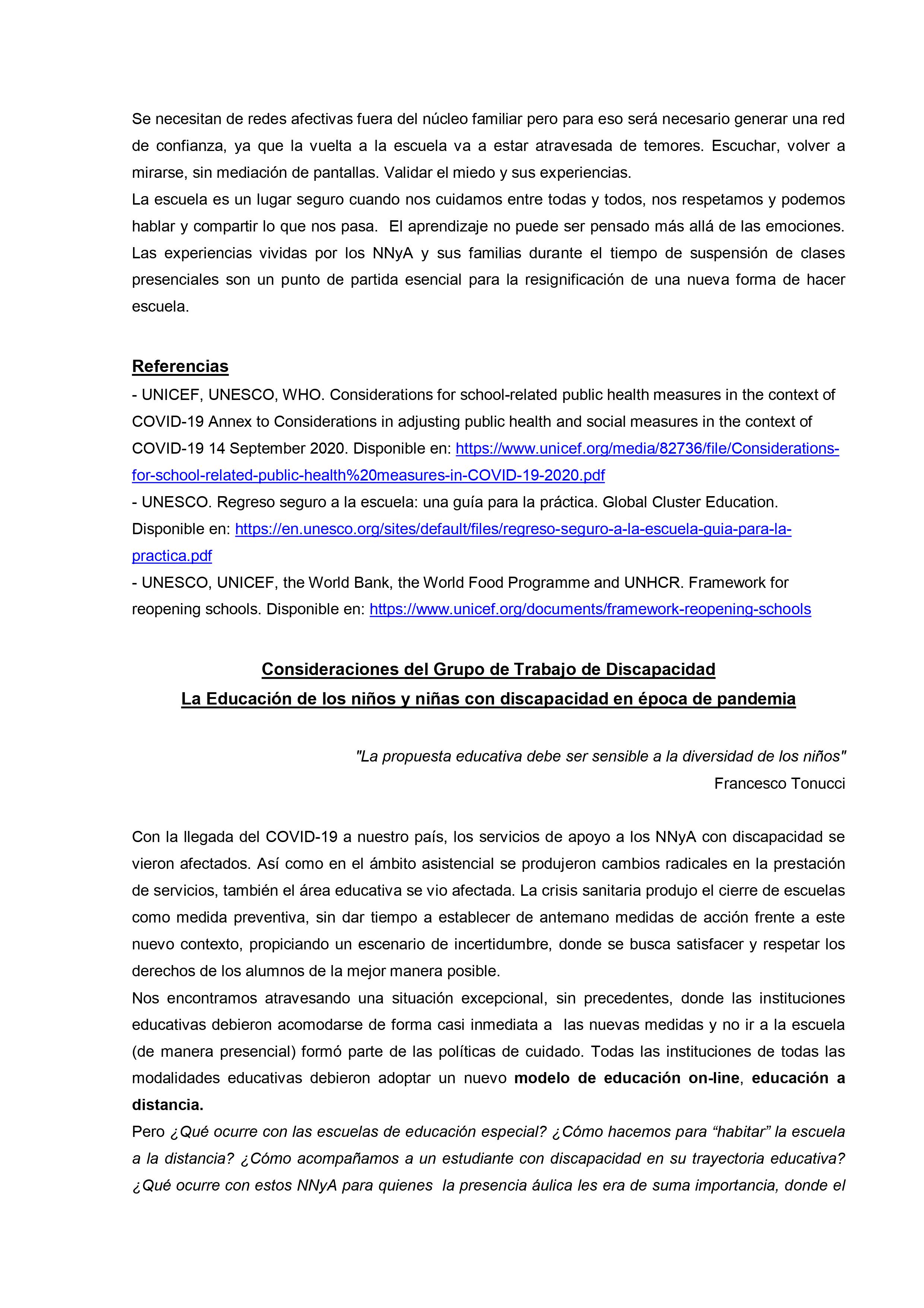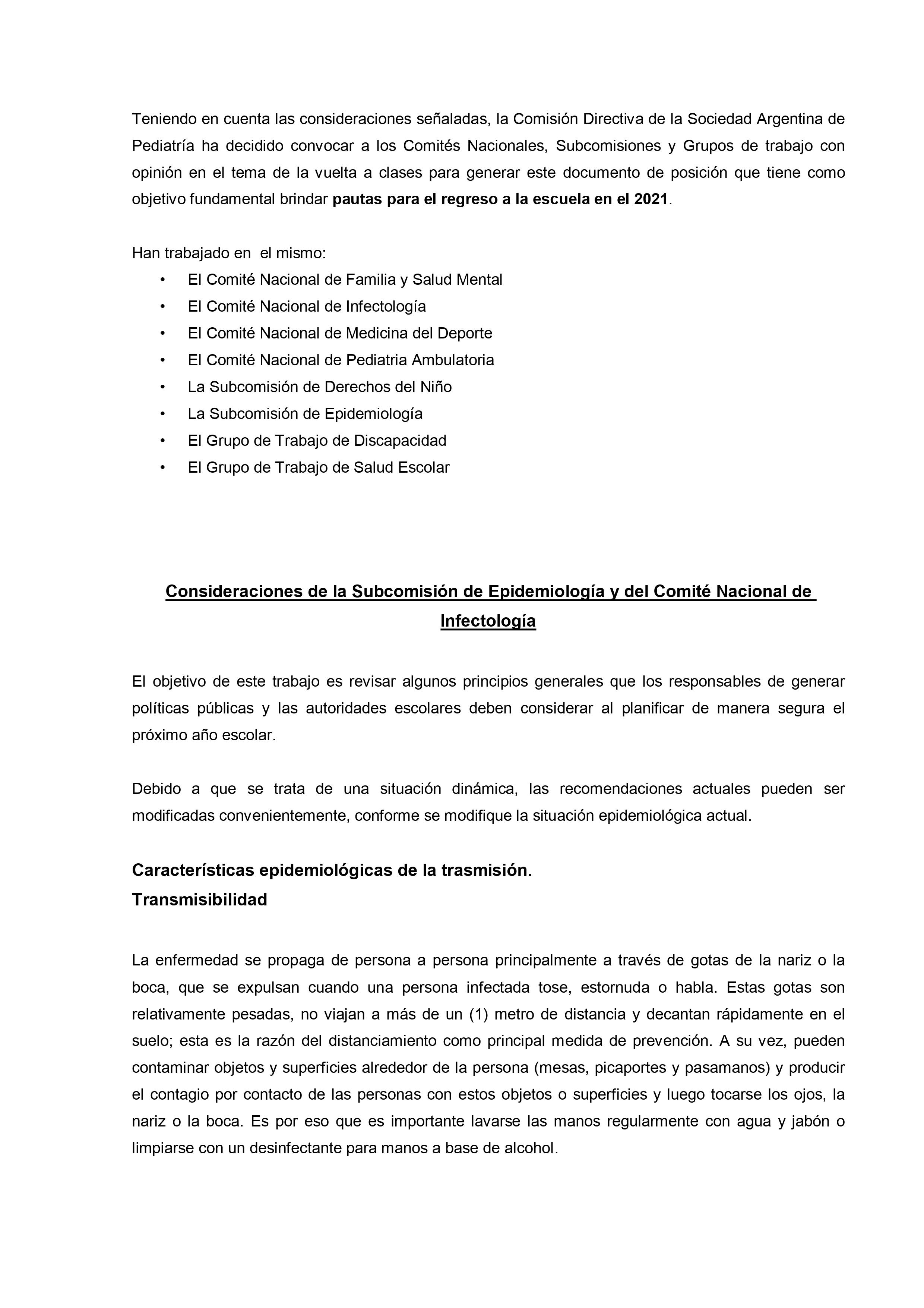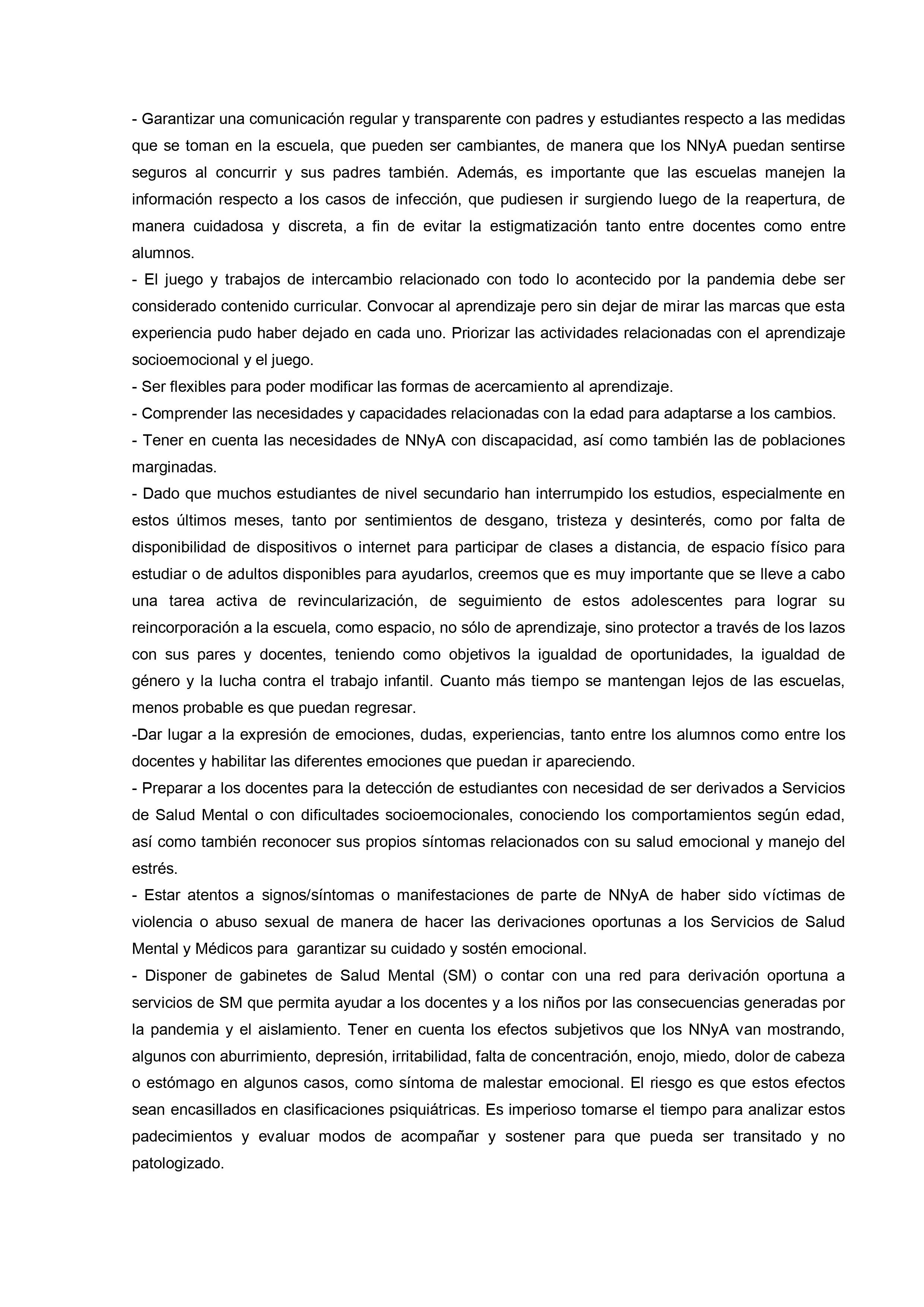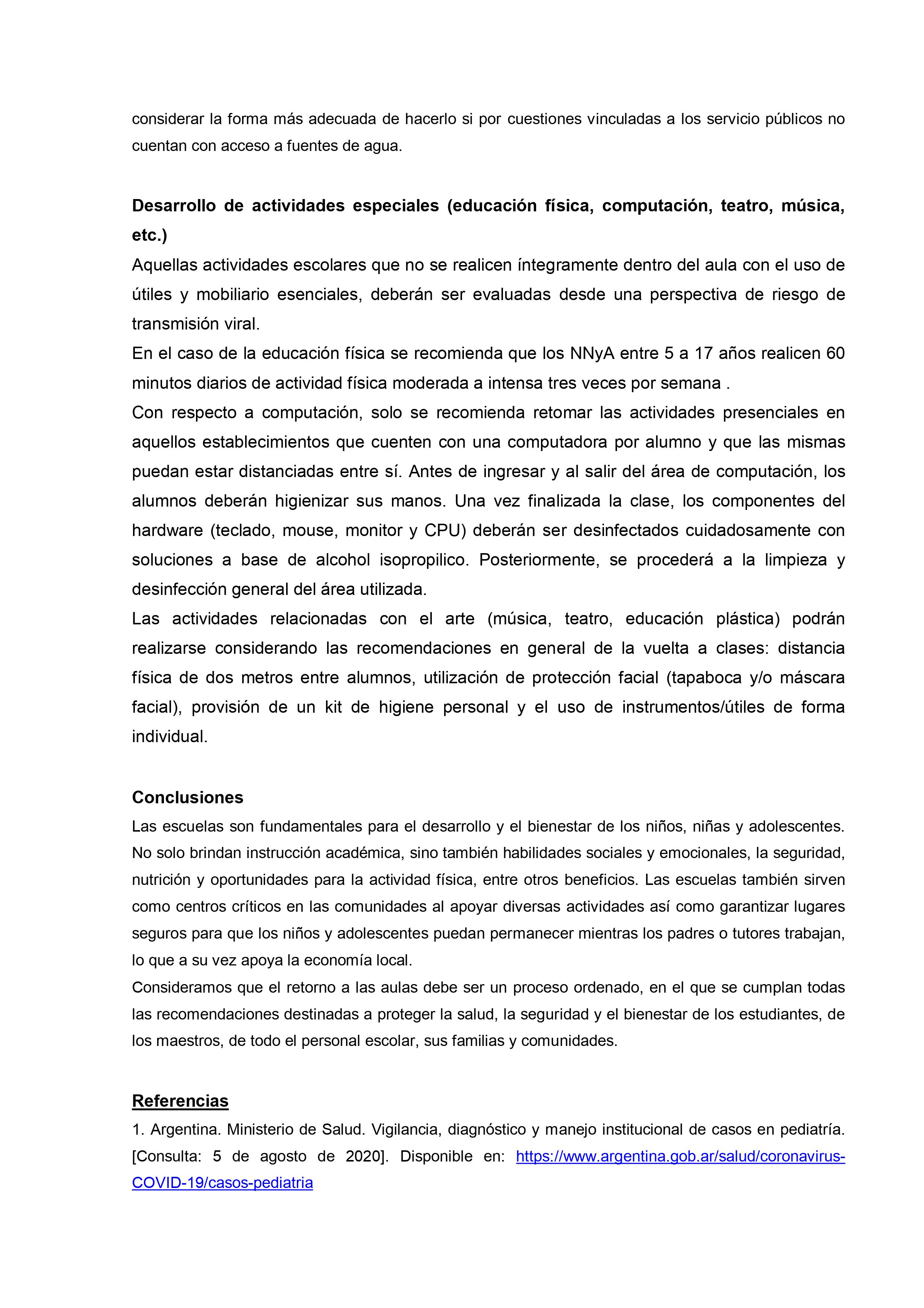 En un extenso informe del que participan otras organizaciones vinculadas al tema desde el ámbito de la salud y del bienestar se sostiene que, con los cuidados pertinentes «es fundamental que las escuelas abran de la forma más segura y rápida posible para reanudar las clases presenciales. Para que las escuelas puedan abrir y permanecer abiertas, es importante adoptar e implementar de manera correcta y constante las medidas correspondientes para desacelerar la propagación del SARS-CoV-2, no solo dentro de la escuela sino también en la comunidad.»
