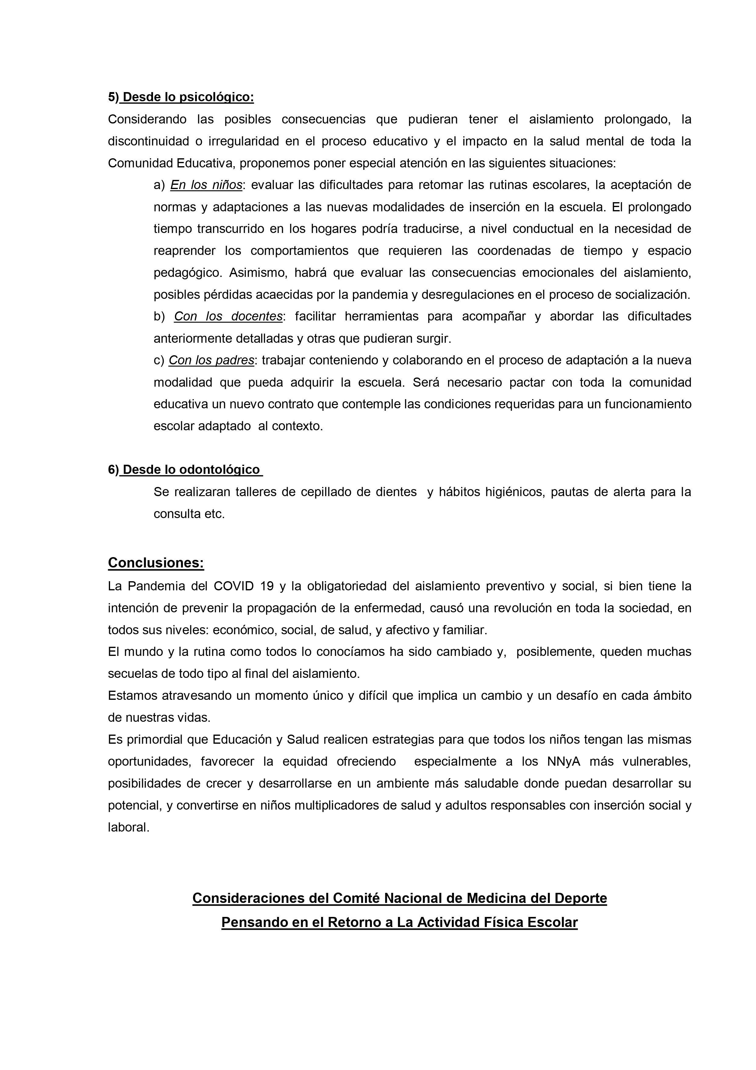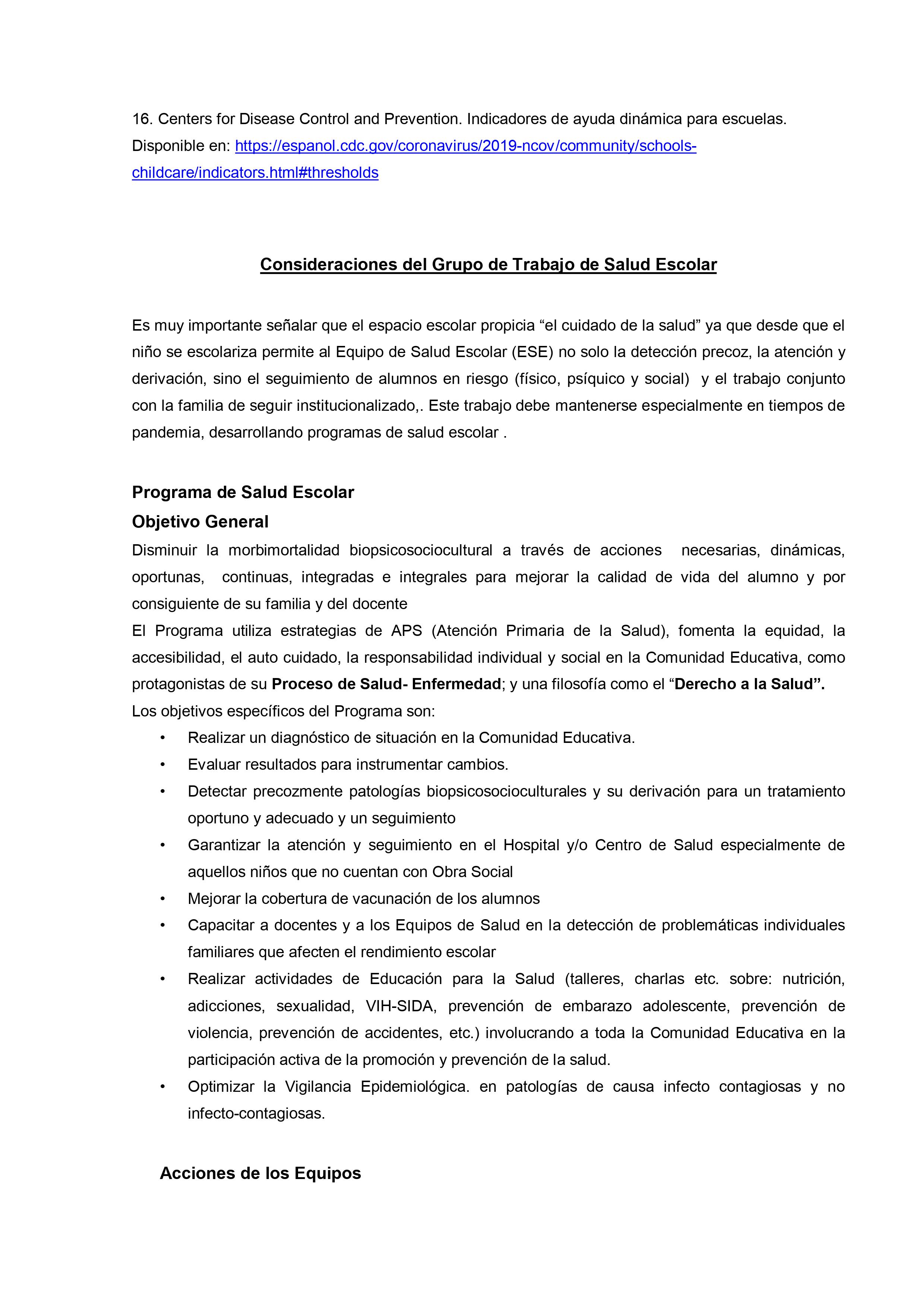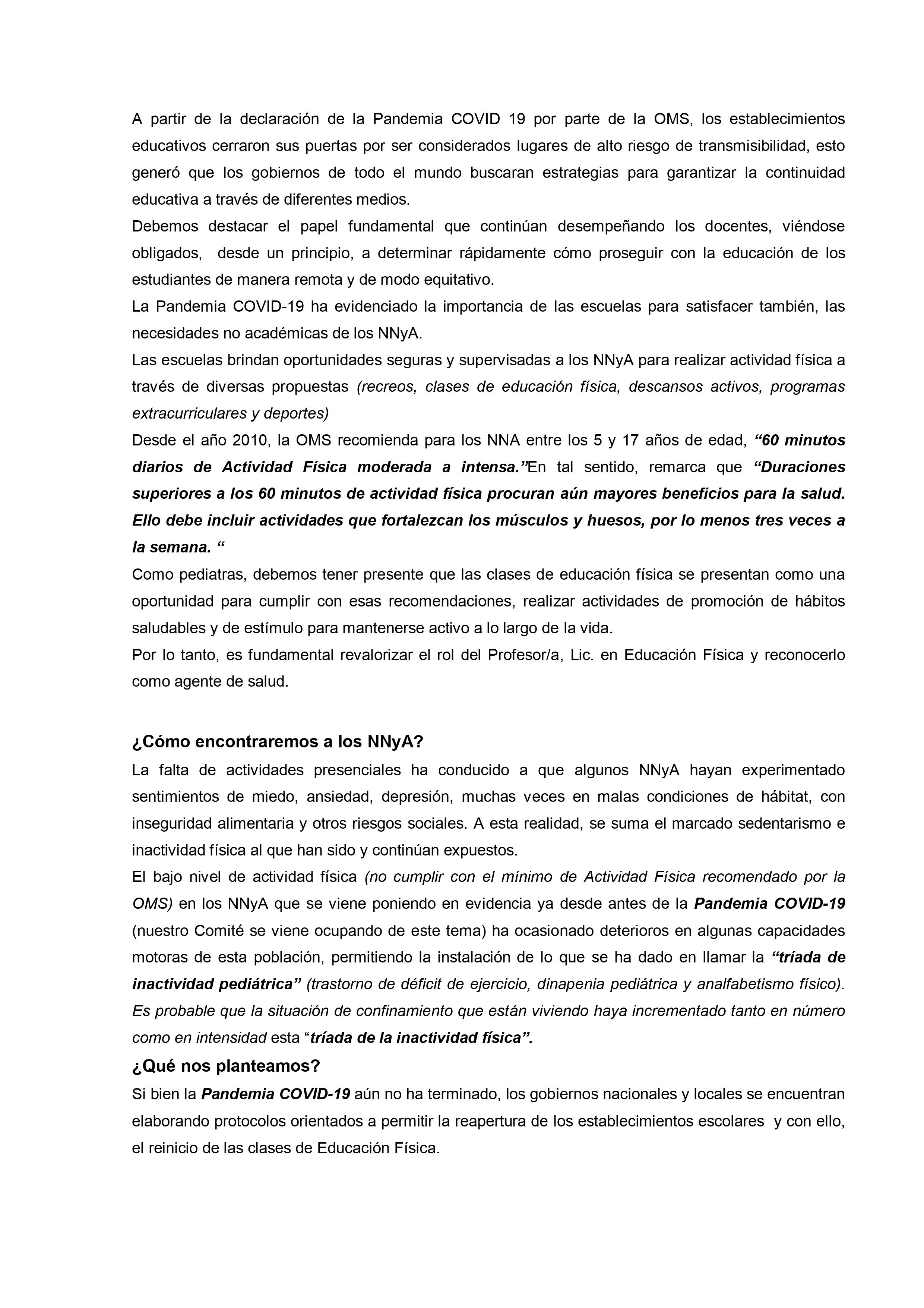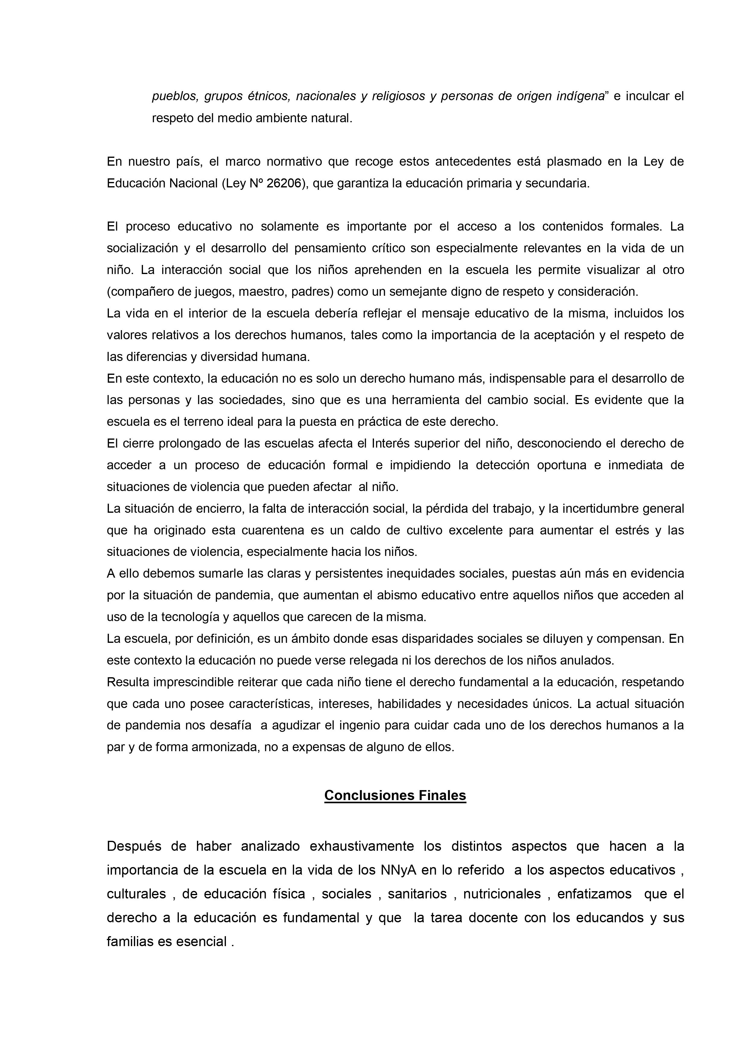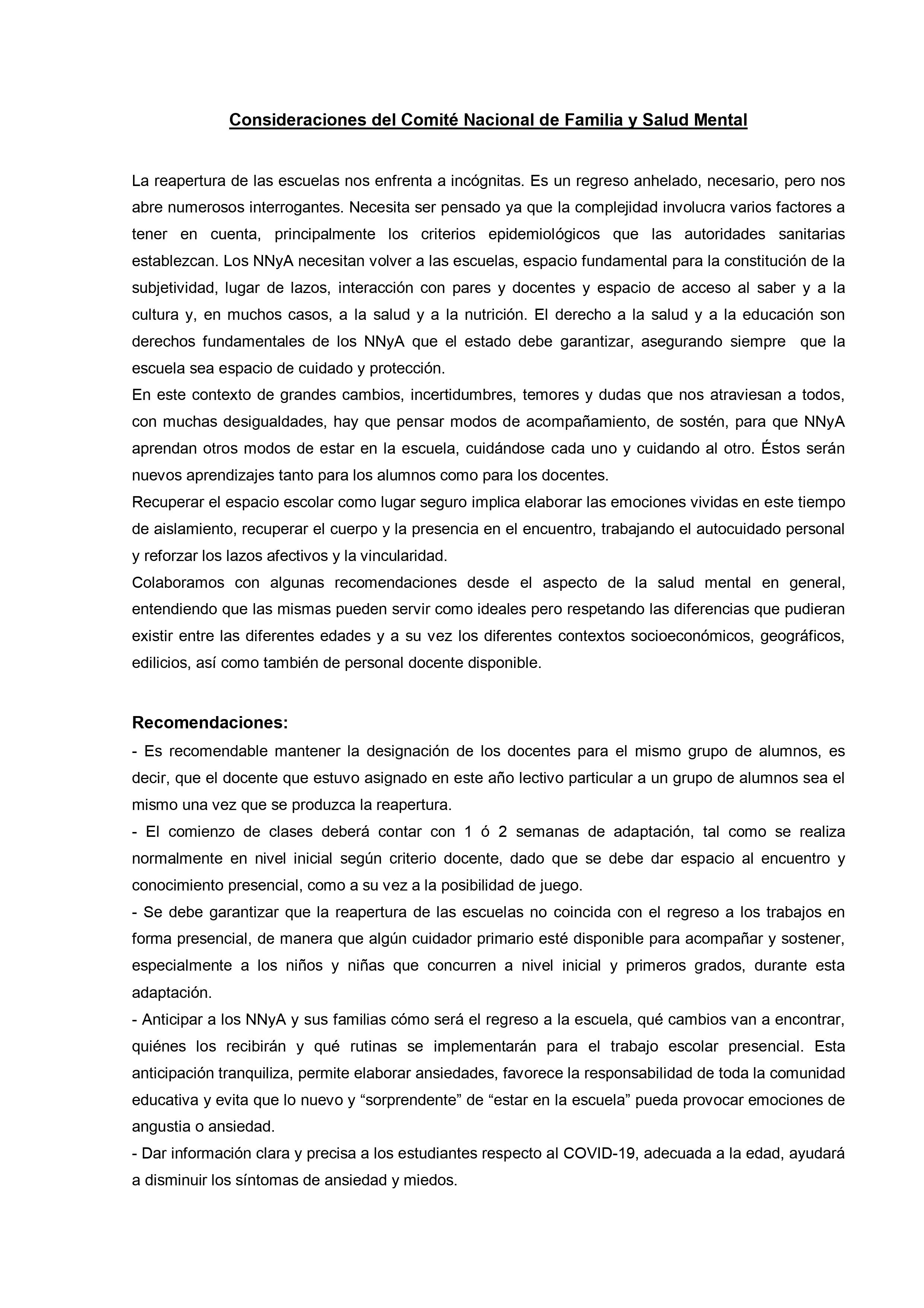 En un extenso informe del que participan otras organizaciones vinculadas al tema desde el ámbito de la salud y del bienestar se sostiene que, con los cuidados pertinentes «es fundamental que las escuelas abran de la forma más segura y rápida posible para reanudar las clases presenciales. Para que las escuelas puedan abrir y permanecer abiertas, es importante adoptar e implementar de manera correcta y constante las medidas correspondientes para desacelerar la propagación del SARS-CoV-2, no solo dentro de la escuela sino también en la comunidad.»
