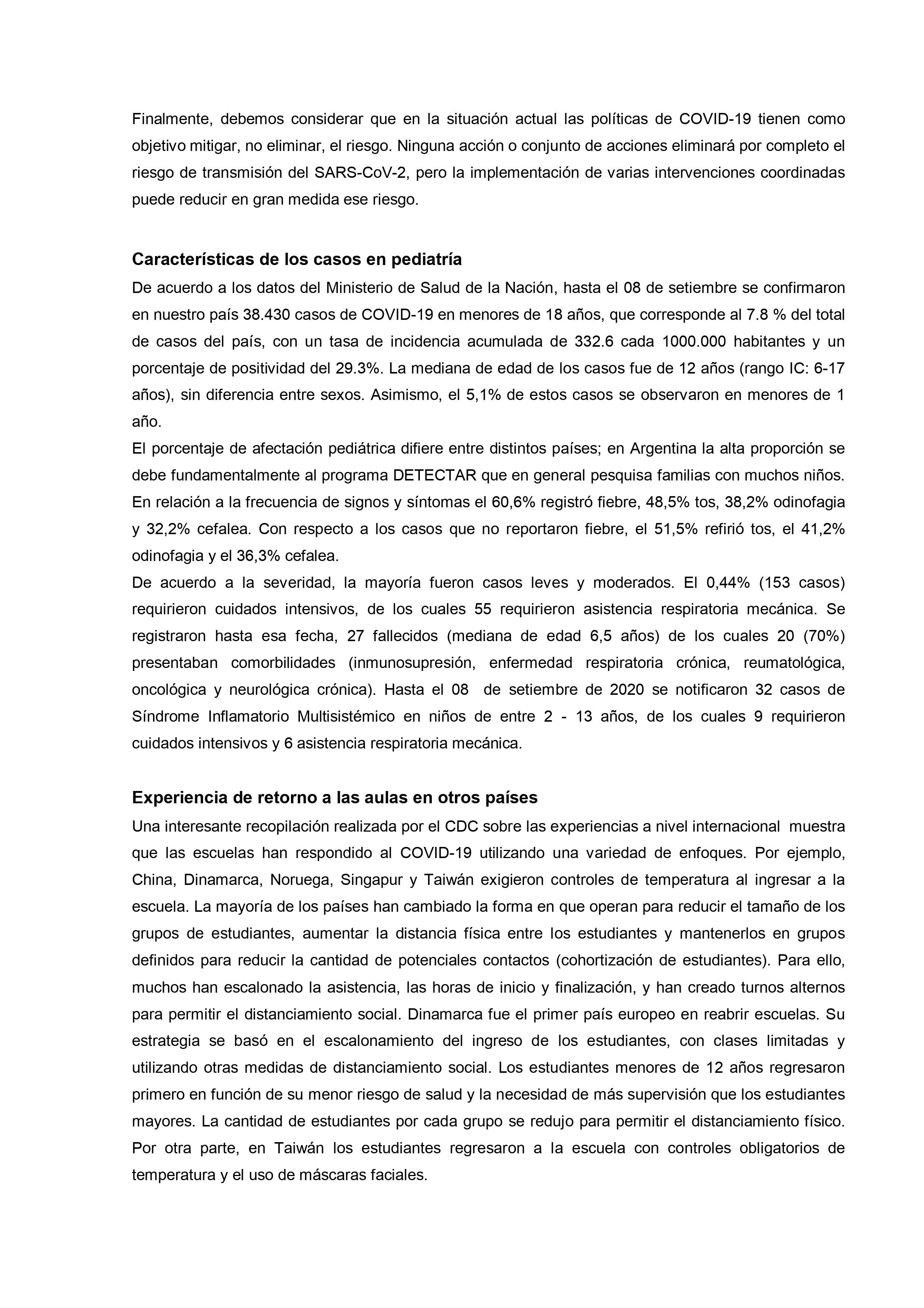 El documento, basado en datos e investigaciones que incluyen las experiencias en otro países, abunda en información e indicadores respecto de los elementos a tener en cuenta en virtud de la necesidad de que los estudiantes vuelvan a las aulas y las posibles consecuencias de ello en términos de la pandemia.