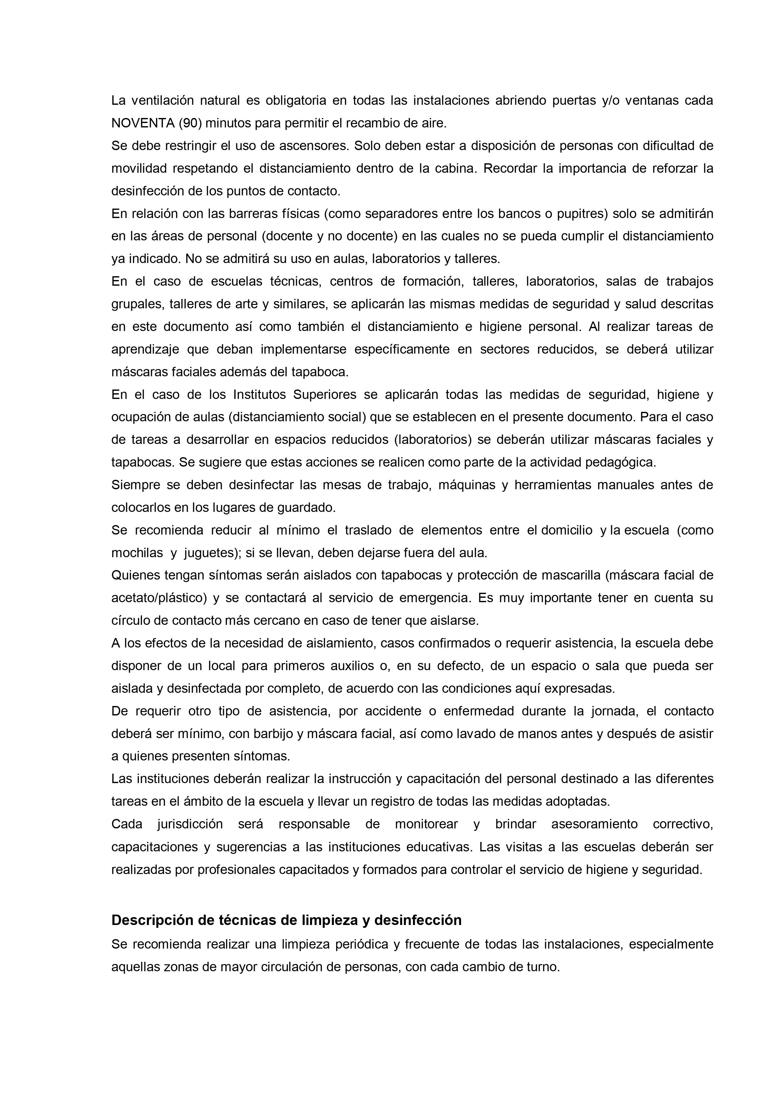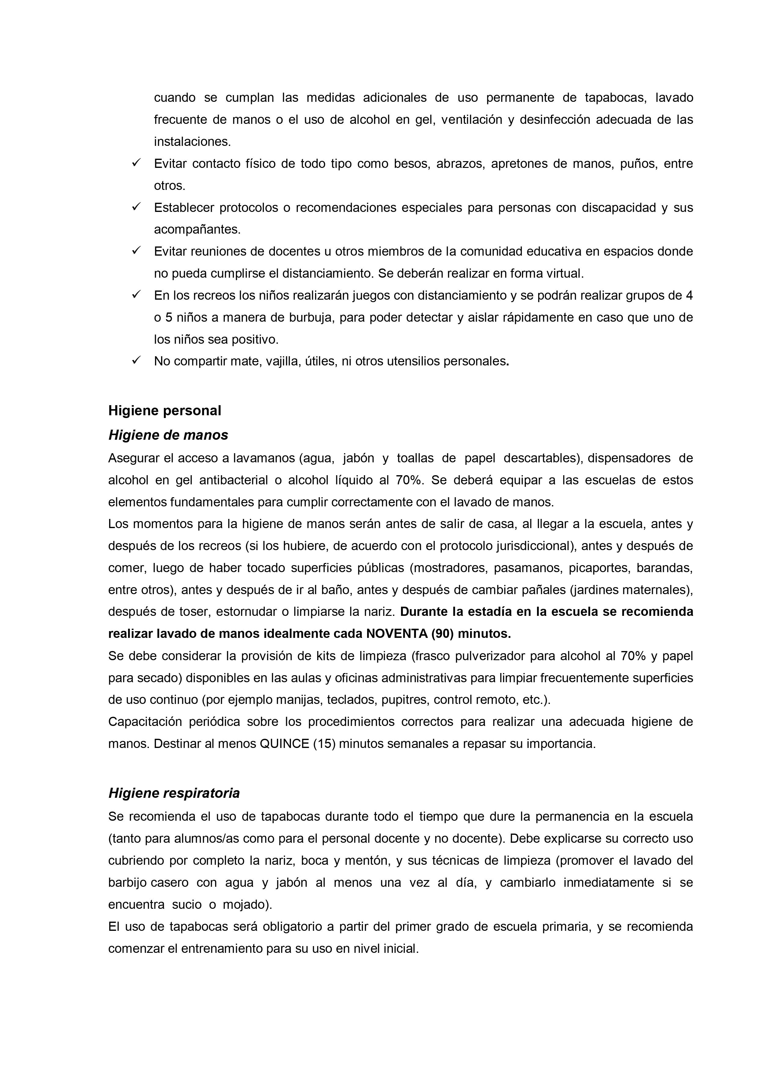 Los momentos para la higiene de manos serán antes de salir de casa, al llegar a la escuela, antes y después de los recreos (si los hubiere, de acuerdo con el protocolo jurisdiccional), antes y después de comer, luego de haber tocado superficies públicas (mostradores, pasamanos, picaportes, barandas, entre otros), antes y después de ir al baño, antes y después de cambiar pañales (jardines maternales), después de toser, estornudar o limpiarse la nariz. Durante la estadía en la escuela se recomienda realizar lavado de manos idealmente cada NOVENTA (90) minutos.